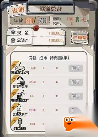 1、开局 首先肯定要开10w的开局(如果大富之家满级可以忽视)然后去约会圣地找大哥,找到这一把就稳了一半,找不到,emmmm开一局也不用太多时间。 2、倒货阶段 这个阶段的操作基于开局的好坏,如果是1所述的开局,那么除了轿车和域名其它都不需要看了(其它都是弟弟),趁两者低价时买入平价时就卖出(非洲人,欧洲人存一下轿车是完全可以的,域名就别想多了)很快就可以离开这个阶段 3、创业阶段 本阶段开始越早越好,但是要保证有100w以上资金用于倒货(不知道为什么老了企业升起来会比较快,年轻的时候就一般慢得可以,怀疑是名声问题),创业求稳建议电器厂(房地产要买得起才行,其它风险较大),这玩意绝对不会跌很多,只会一直涨。 此时手中一直保留100w到300w倒货其它全部无脑投入企业。 达到一定财富(2000w左右?)之后可以适当屯一批轿车和域名,不暴涨也不会亏。 以上这些基本能够上5000w,上亿还是要看企业发展如何。 4、最后阶段 这种打法一般上亿都是60+了,毕竟稳健刷点数打法,所以,不要挖煤!不要挖煤!不要挖煤!上亿之后点数增长相当缓慢(取对?反正一亿就多几十)而一年就塌的损失很难赚回来(毕竟咱非洲人)守着企业等结束就好了。