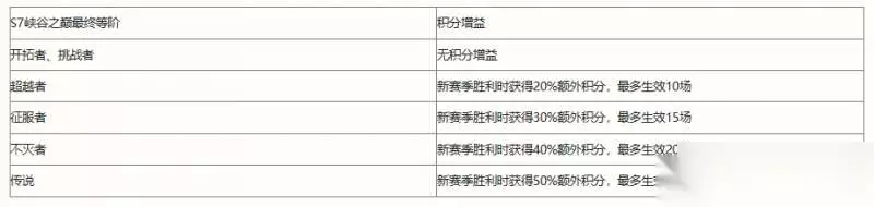 二、结束时间 S7赛季将于1月17号结束。 三、峡谷之巅 S7峡谷之巅的等阶也将进行重置,重置规则和上赛季保持一致,详情如下: S7结束时最终等阶在挑战者IV 50分以下维持原分数不变 S7结束时最终等阶在挑战者IV 50分及以上全部重置到挑战者IV 50分,并根据重置前分数获得不同的积分加成增益: