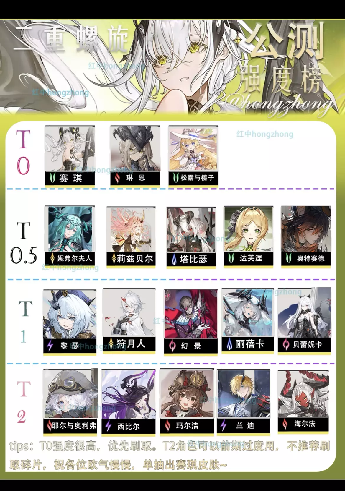 1、委托密函刷取 🔸琳恩:强力输出,琳恩主要靠⼤招输出,大招范围大,清杂快。 🔸丽蓓卡:挂机队核心,预约奖励操作无脑,较为吃队友,玩挂机队,优先刷取队友塔⽐瑟会有不错提升 🔸达芙涅:增伤奶⻆⾊,配队十分万金油,前期刷取优先输出,因为松露也是增伤奶,而且获取简单。 🔸奥特赛德:强力主C,对单体输出特化,输出⼿法简单,⼤招隐⾝可以创造不错输出环境 🔸妮弗尔夫⼈:聚怪辅助,聚怪割草,强力辅助~本身输出略低。 2、梦魇残声刷取建议 🔸 松露与榛⼦:新⼿过主线任务获取,增伤奶⻆⾊,含金量极高,松露2命时解锁队伍增伤 角⾊⽣命值⾼且前期输出较⾼,适⽤于⼏乎所有前期配队和副本。 🔸塔⽐瑟:丽蓓卡挂机队伍核心之一,兼具控制与增伤的强⼒辅助,配合丽蓓卡技能输出稳定 🔸利兹⻉尔:光系主C ,输出强⼒,手法简单(释放⼤招后,左键蓄⼒)。 部分对策角色,推荐队伍成型后刷取 🔸海尔法:挂机队的构造卡之一,强度较低。优先级不过。除非玩挂机队,否则前期不建议刷取 #二重螺旋 #二重螺旋攻略 #二重螺旋公测征集 #二重螺旋公测