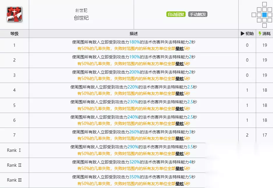 3、二技能:创世纪 开启技能之后会使周围所有的敌人受到法术伤害并且失去特殊能力2秒,这个技能会有50%的失败概率,失败之后会使所有有我方干员全部眩晕5秒。
