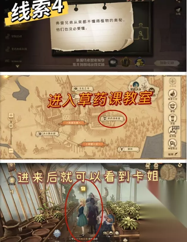 t15_2-t15_1:7.0 标签: 弗雷 哈利波特魔法觉醒10月7日其中一个拼图线索是“弗雷兄弟从来都不懂得植物的奥秘,他们也没必要懂”,很多小伙伴不知道去哪里寻找,今天就带来了详细的位置介绍,也有去往的方法,一起看下吧。 哈利波特魔法觉醒弗雷兄弟从来都不懂得碎片在哪 拼图信息: “弗雷兄弟从来都不懂得植物的奥秘,他们也没必要懂。” 拼图位置: 打开地图,进入草药课教室,进来就可以看到卡姐,和卡姐跳舞之后就可以获得拼图碎片。