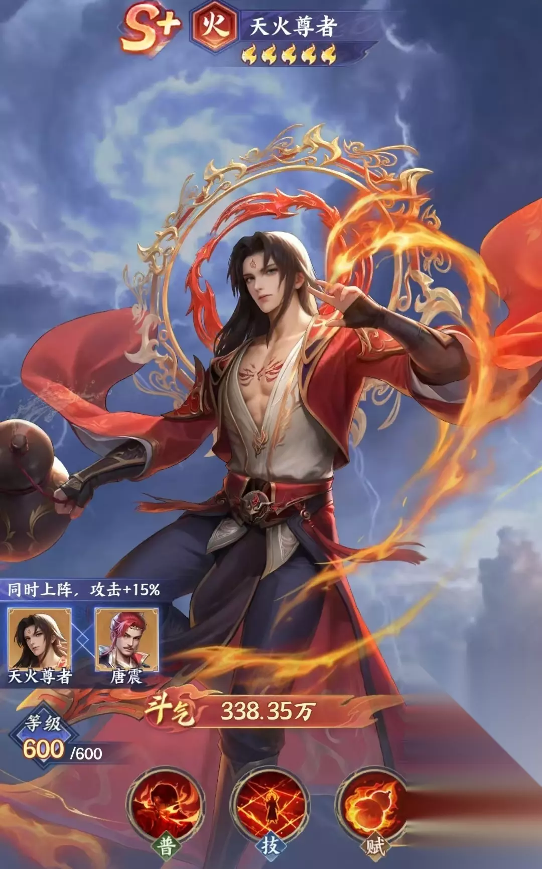 在《斗破苍穹》手游中,天火尊者作为高人气斗尊级战力角色,凭借其鲜明的火系定位与机制深度,稳居S+稀有度核心输出行列。该角色原型源自原著中期关键战力,在剧情中受萧炎所救后成为重要盟友;游戏中则延续其“焚尽八荒”的战斗风格,是构建高强度持续伤害体系不可或缺的战术支点。