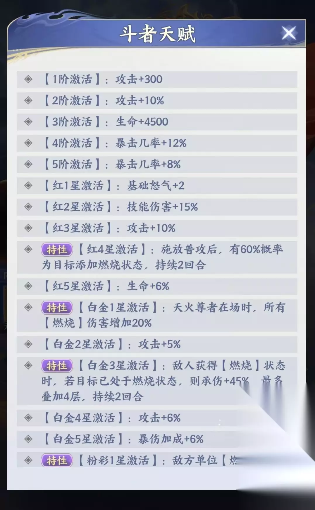 其主动技能“空间绞杀”具备全体目标打击能力,并附带燃烧状态施加效果,触发概率随技能等级提升而增强。燃烧持续两回合,每回合造成相当于施法者30%攻击力的真实伤害(无视防御),构成稳定DOT输出基础。升星机制进一步强化灼烧体系:红四星解锁普攻附加燃烧效果;白金一星起,全场燃烧伤害提升20%;白金三星实现燃烧叠加伤害增益;粉彩一星则赋予燃烧蔓延机制——当敌方单位燃烧状态被清除或驱散时,将自动转移至相邻目标,大幅提升多目标覆盖率与连锁压制能力。