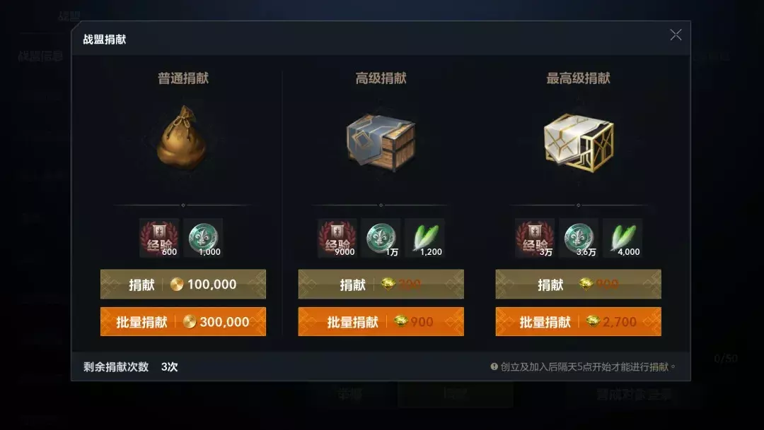 捐献每日至多3次,最基础的是金币捐献,每次10万金,完成后可以获得战盟经验以及名誉勋章!