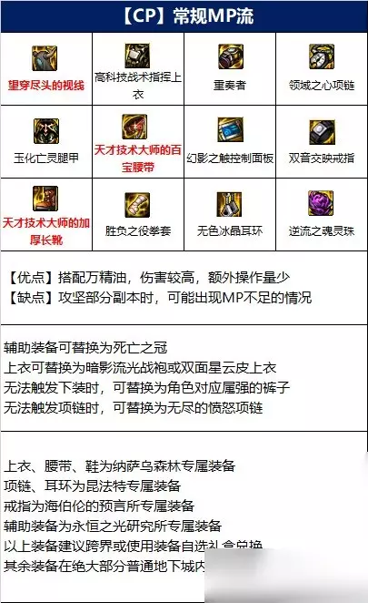 男散打110级版本虽然cp武器属性优秀,但有着一定的限制,因此大部分装备围绕CP武器搭配,但是仍有部分流派需搭配制式武器。流派共有四种,分别为:常规MP流、低血MP流、无色狂暴不死流和出血MP流(制式武器)。具体的配装可以看看下面的详细搭配。 《DNF》男散打110级装备搭配 1、常规MP流