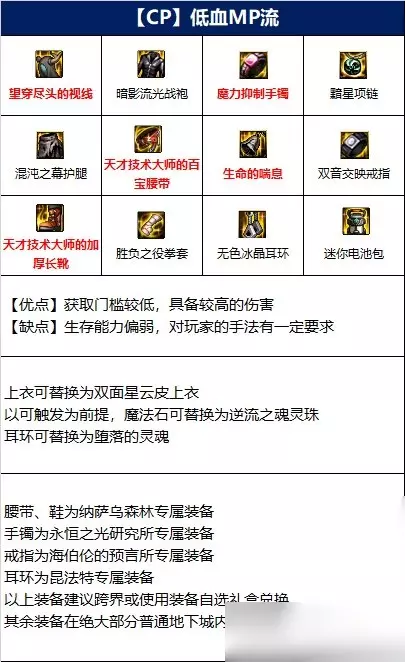 全职业的万金油搭配,伤害高,额外操作少,但是因为MP消耗量极高,因此需要备好大量MP药剂。在部分限制药剂使用的副本会比较尴尬。 2、低血MP流