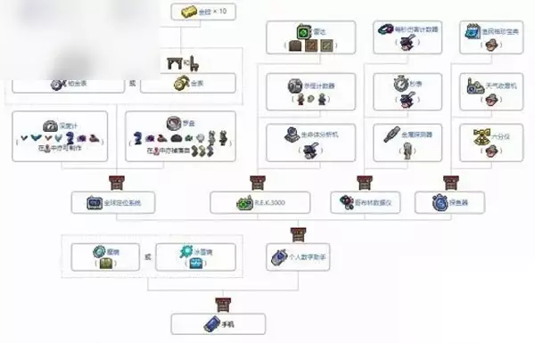 二、合成材料 13个材料:罗盘、深度计、每秒伤害计数器、渔民袖珍宝典、金表或铂金表、生命体分析机、魔镜或冰雪镜、金属探测器、雷达、六分仪、秒表、杀怪计数器和天气收音机。 三、材料获取方法 1.金表/铂金表:使用10个金锭/铂金锭和1个链条在桌椅处合成,能够显示时间并且精确到分。与之类似的还有铜/锡/银/钨表,前两个精确到小时,后两个精确到半小时,但要注意的是,虽然它们都有显示时间的功能,但仅有金表和铂金表能参与手机的合成。 2.深度计:能够显示当前玩家的脚部所在的深度,要注意其显示的数值为2/格。击杀某些蝙~蝠、蝾螈、巨型卷壳怪和龙虾有小概率掉落。 洞穴蝙~蝠、巨型蝙~蝠、丛林蝙·蝠、孢子蝙~蝠、冰雪蝙~蝠——1/100 蝾螈、巨型卷壳怪和龙虾——1/80 3.罗盘:能够显示当前玩家相对于世界中心所处的水平位置,其显示的数值同样为2/格。击杀蝾螈、巨型卷壳怪、龙虾、食人鱼、史莱姆之母、小雪怪、亡灵维京海盗和装甲维京海盗有小概率掉落。 蝾螈、巨型卷壳怪、龙虾——1/83 食人鱼——1/75 史莱姆之母、小雪怪、亡灵维京海盗和装甲维京海盗——1/50