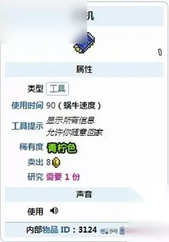 9.金属探测器:能够显示玩家附近贵重物品的名字,探测范围依据玩家的脚所在位置为中心,为水平方向为85格,垂直方向60格。1/2几率掉落自迷失女孩(宁芙),若在专家或大师难度下,则必定掉落。与生命体分析机相类似,高价值的物品会遮住低价值的物品,除开矿石外,物品的价值排序为生命果>生命水晶>奇异植物>宝箱>沙漠化石/坚固化石>罐子。 10.天气收音机:能够显示当前地表的天气和风速; 11.六分仪:能够显示当前月相; 12.渔民袖珍宝典:能够显示玩家目前渔力。如果松露虫为当前鱼饵,则会显示“警告!”而非数字。 13.完成渔夫的钓鱼任务后有1/40概率获得以上一件物品,如果你的物品栏或任意一个额外背包(例如飞猪)中已有渔民袖珍宝典,则渔夫不会再将其奖励给你。但是,如果你同时拥有渔民袖珍宝典、六分仪、天气收音机或是拥有探鱼器、个人数字助手、手机,渔夫就能重复给予渔民袖珍宝典。