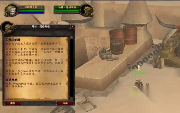 任务步骤: 1、进入游戏后在塔纳利斯的加基森与马林·诺格弗格对话接受口渴的地精任务