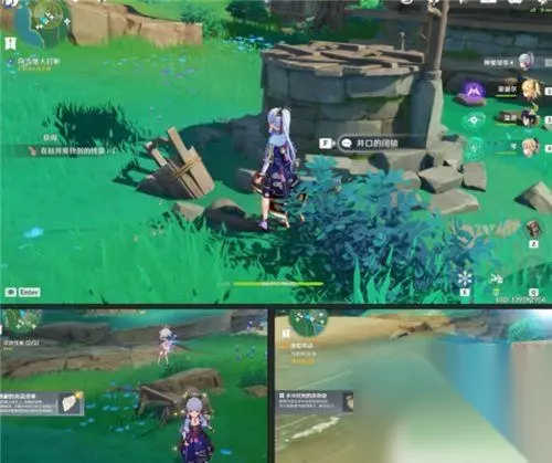 然后,到村长家后院井边找到摩拉钱袋,根据小猛的提示找到残破货物清单和水中货物袋三个证据。