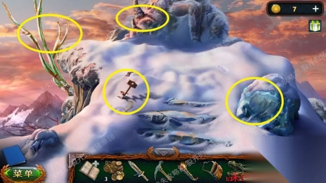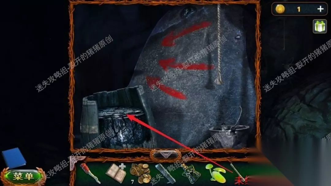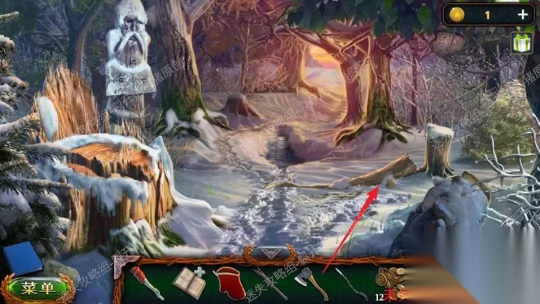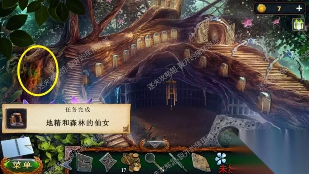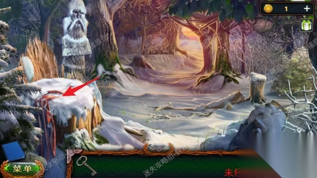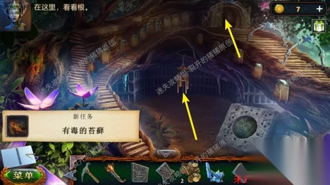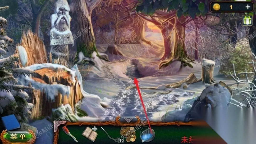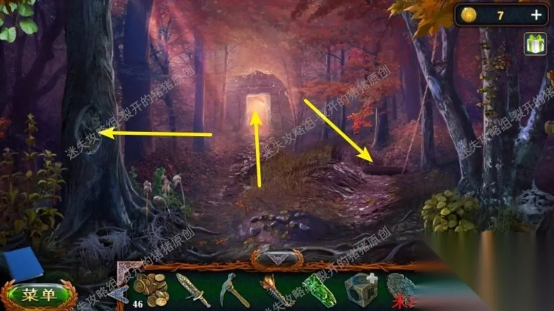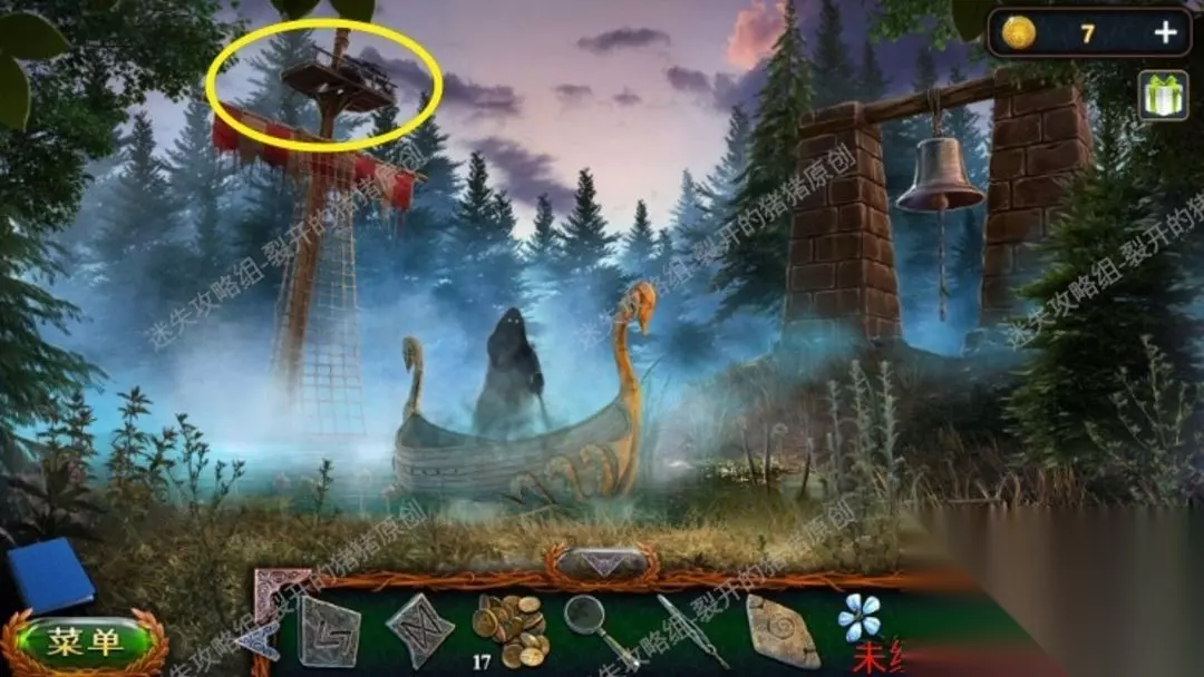46.返回沼泽中点击树上的鸟,向它扔球果,用勾杆拿到大徽章,退到山林当中,中间地面我们用园艺抹刀,拿到金币。46.1