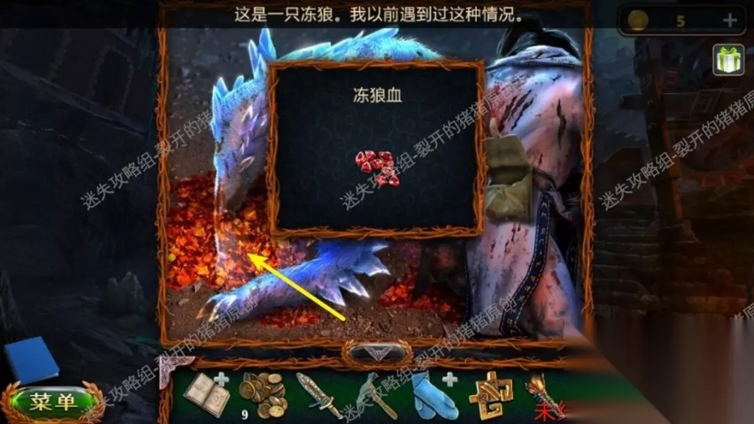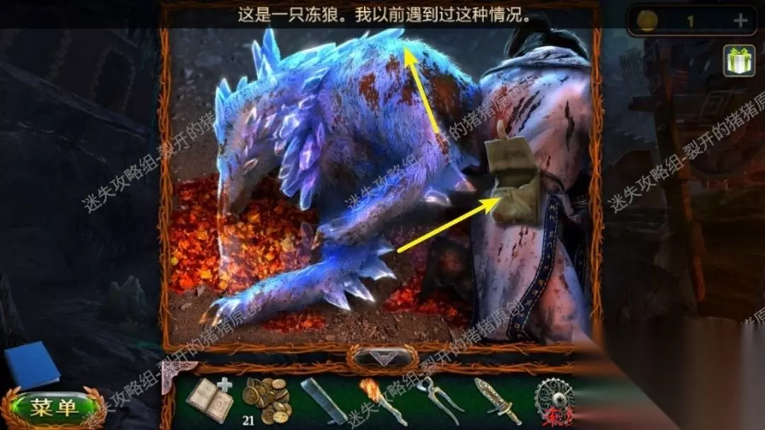 31.回到洞边处,我们用锤头在去世的狼身上得到冻结的血,以后回到地穴里,点击右侧的箱子放入钥匙,拿到钥匙的残片和提示板及其点卷。