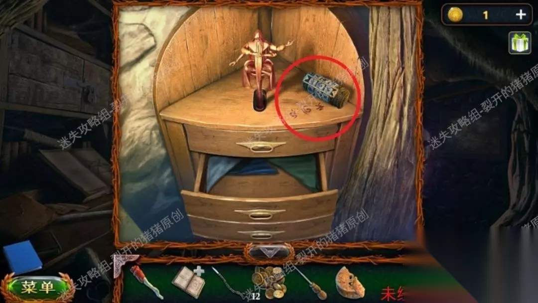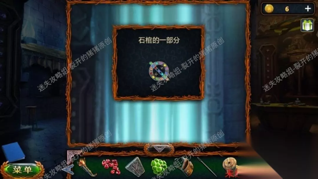 34.把花纹的一部分放进凹陷洞的上沿上边的石门便会开启,再下挑檐我们能拿到钥匙的一部分,以后进到石室,在石室左边的桌上拿到针和线轴,左边的墙面(带纹路的砖头)按住能够拿到推测之粉及其点卷,再去中间石桌子放入推测之粉拿到钥匙底端。