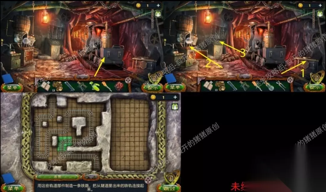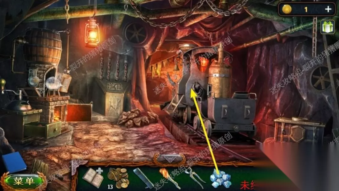 18.点击撞毁的矿车把石块剥开,拿到门把装上带动,从地底会有一辆相近火车的代步工具升起来,在右侧拿到钳子,左边的火炉处拿到空瓶子,用火堆把火炉引燃,点击3号部位,完了轨道的拼凑。18.118.2