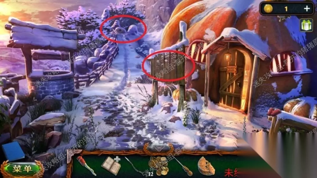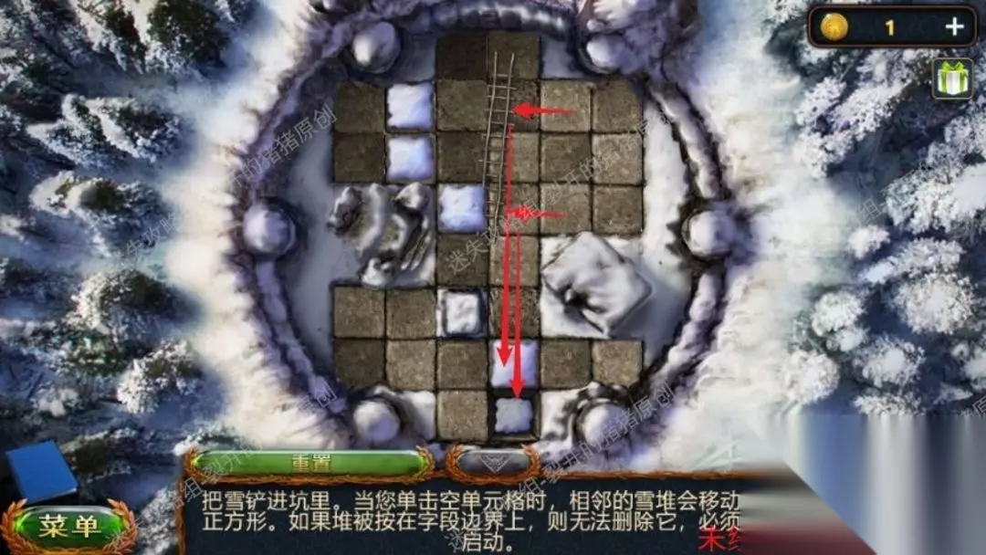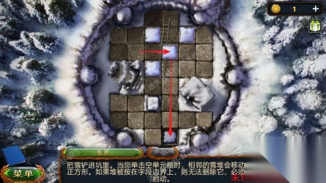 2.我们用铁铲点击雪地逐渐一个铲雪小游戏,结束后我们的梯子便会架好我们就能去上面了(游戏并不困难,如图所示,先将下方雪丢进坑内,在把右上角的雪先解决)2.12.2