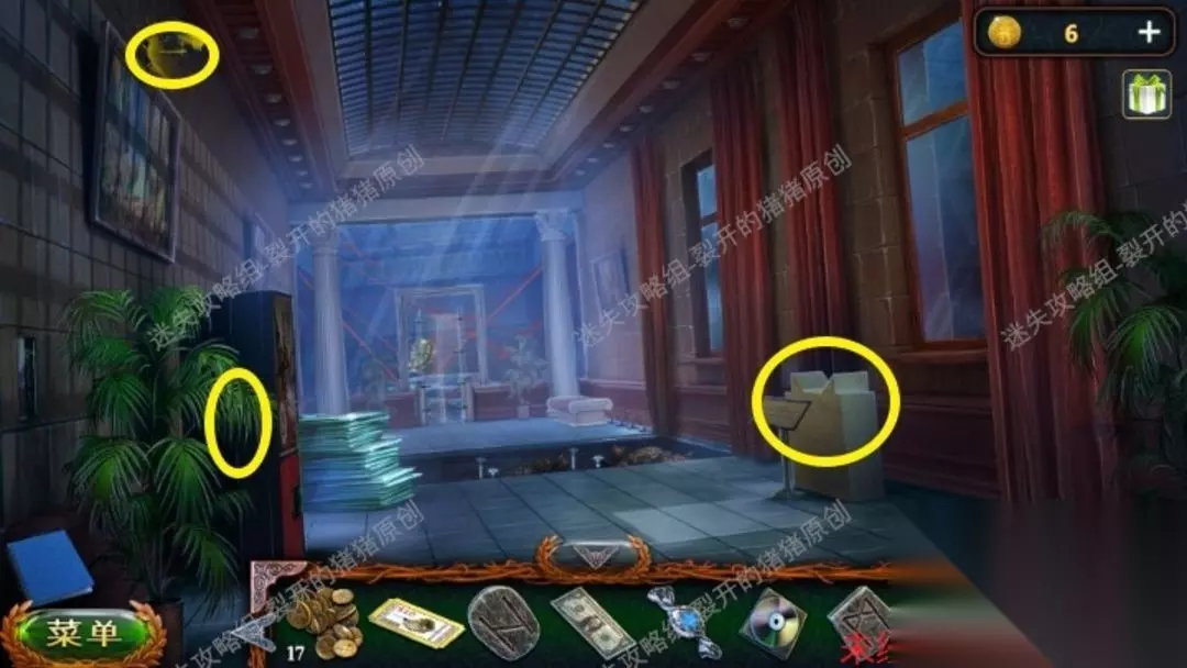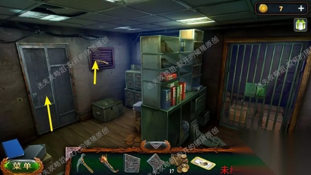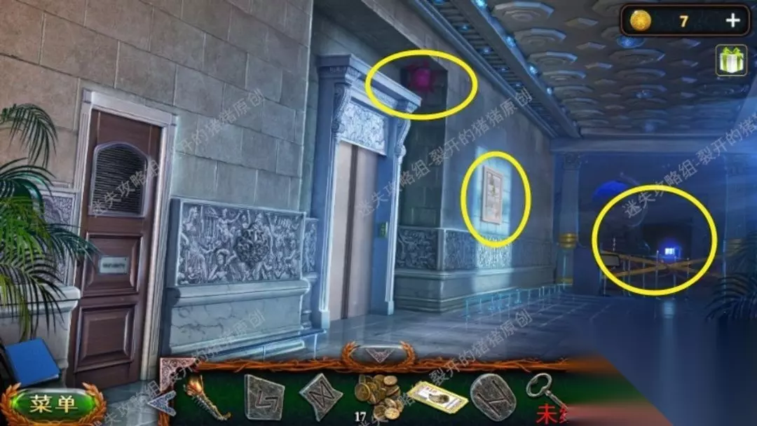 56.进到大厅先点击电梯顶上的监控摄像机,关掉以后我们来到入口,拿到一个铭文,人然后点击左侧墙上的壁画拿到钥匙,用钥匙打开左下方的办公室,进到。56.1