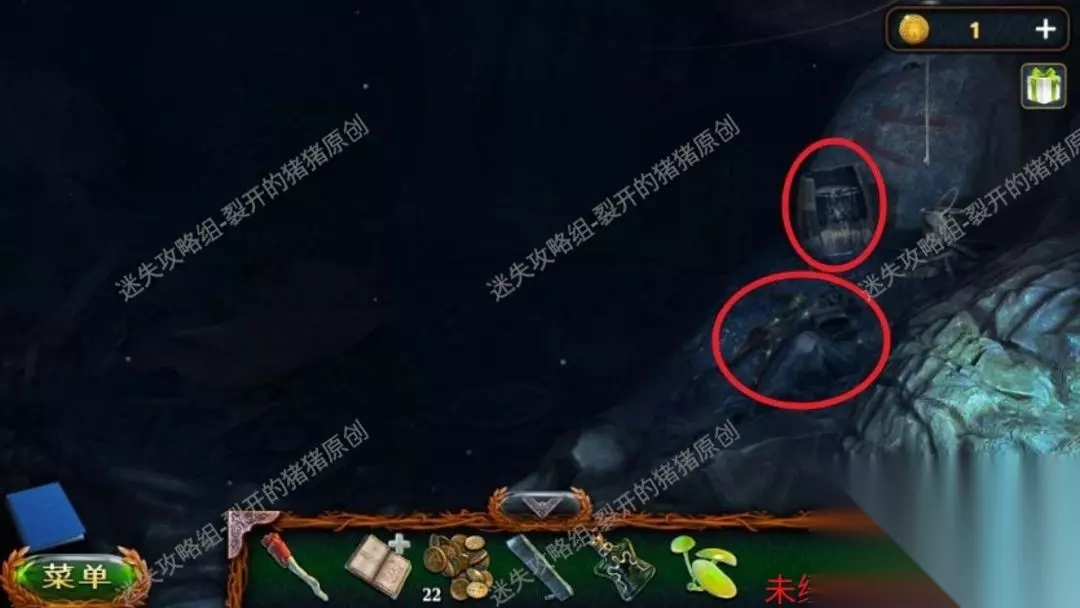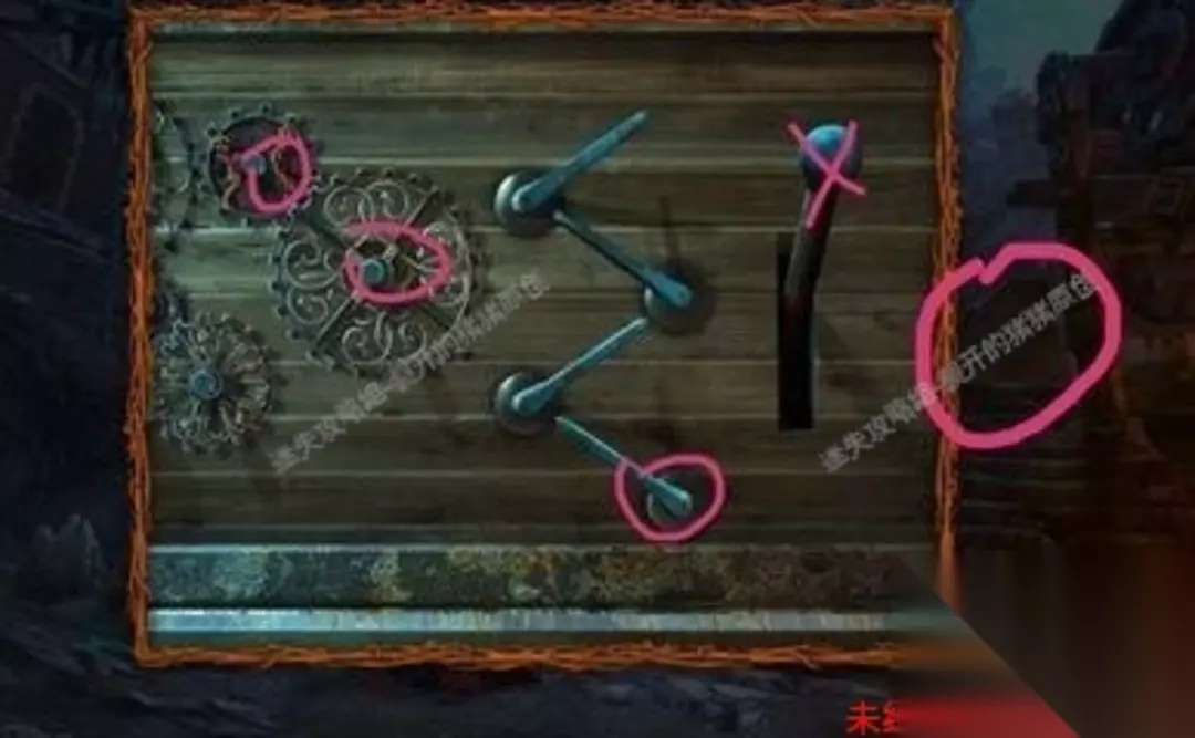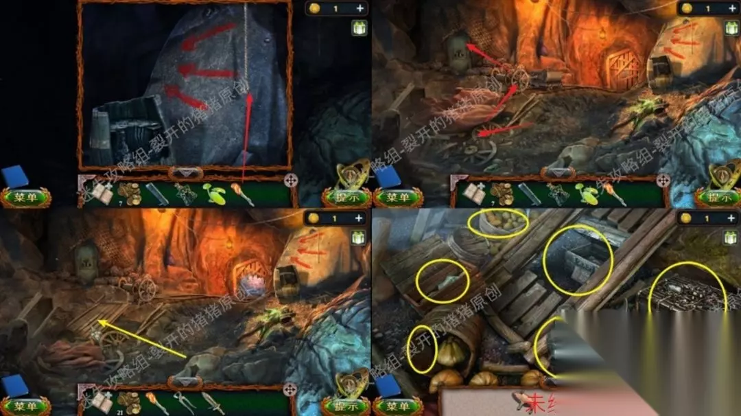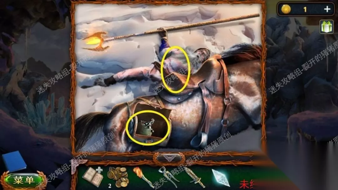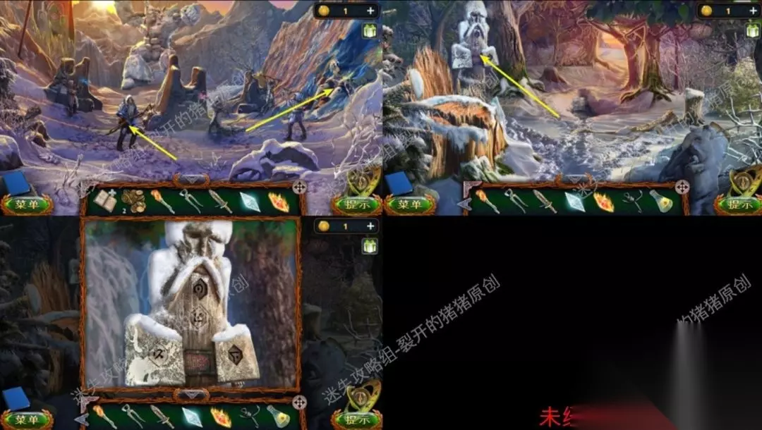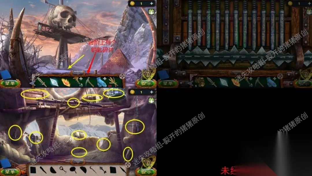 22.进到洞边以后我们看到了一个人和一只狼在搏杀,我们从遗体上拿到刀子及其金币和机械零件,以后点击右侧的墙面完成一个拼图游戏。22.122.2