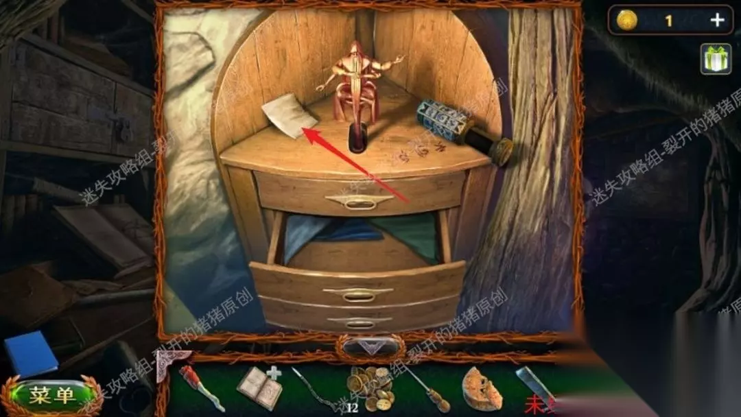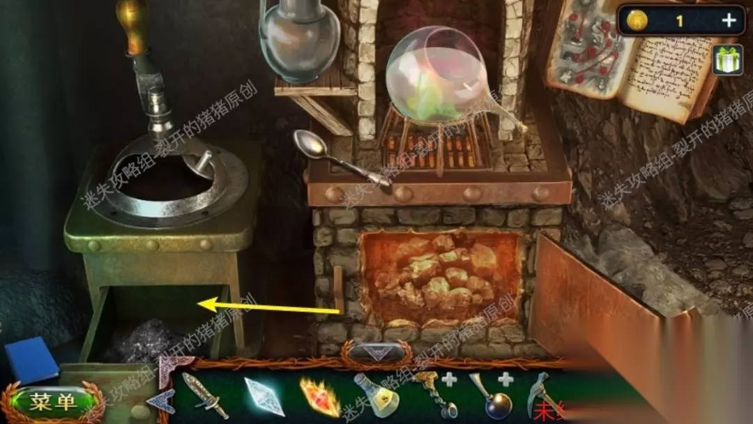 37.再次进入石室,在左侧墙上挂上绒毯残片,用到针线结束后收看剧情,看完后拿到冷酷灵药的配方,大家点击右侧的炼金餐桌,放入秘方,依据秘方放物件拿到冷酷灵药。37.1