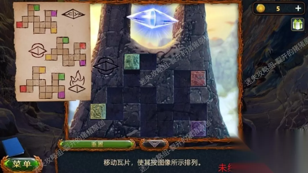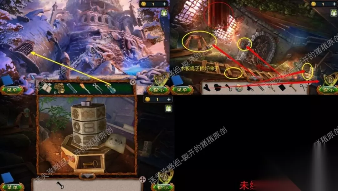 29.抵达右侧的峰顶后,我们把地上的四根木柱拔出,台阶上捡到钥匙残片,右侧地上捡到金币,左侧也有三个金币,我们把木板放进上去的立柱里,用锤头进行修补,上来后有一个转轴游戏,如图所示我们用鼠标单击就可以换面,结束后逐渐寻物游戏,结束后拿到穹顶原素。29.129.229.3