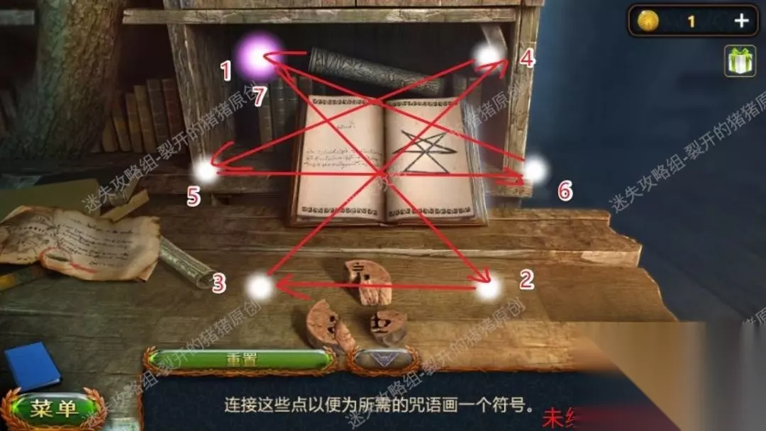 42.开启魔法书,放入手隆的盒子应用启发的符咒,拿到符文石,返回马隆的小屋处,在左边放入符文石,打开黑暗森林,在左边树洞用短刀拿到树果实,再去右侧的人手处拿到弩和锁匙的一部分,出圈套应用弩箭。42.142.2