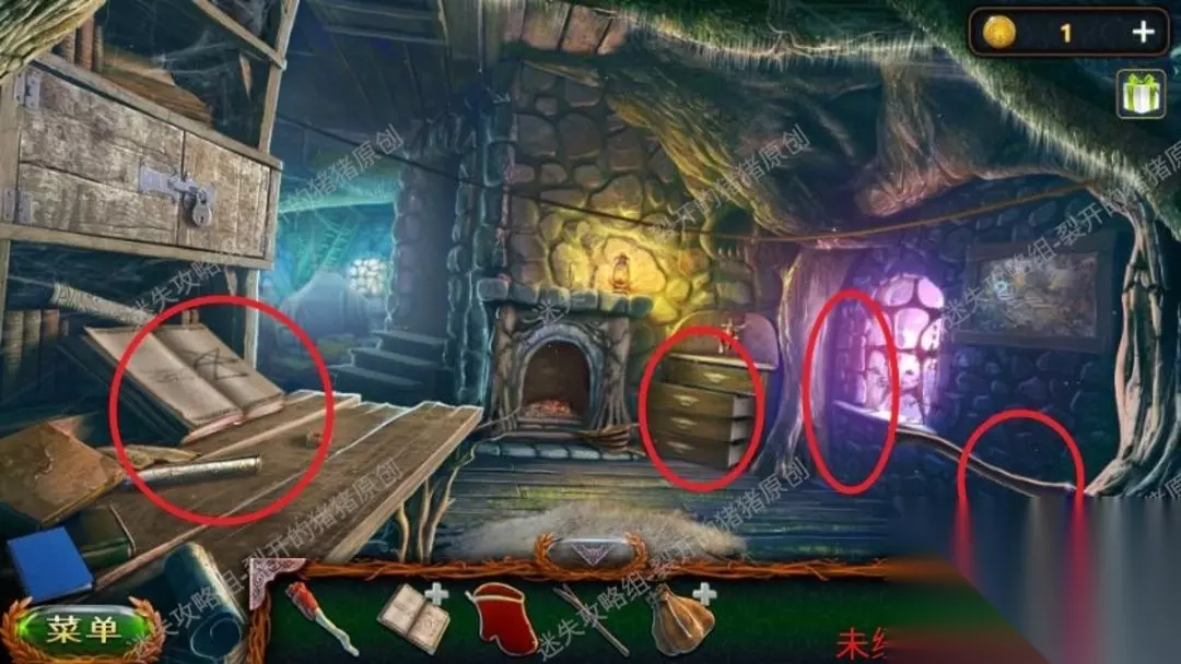 6.进入房间后,取走左侧桌子上的魔法书及其手套,在右侧的角落拿到竿子及其右侧卡住树里的斧头,也有抽屉里的钱包(最后第二层)。6.1