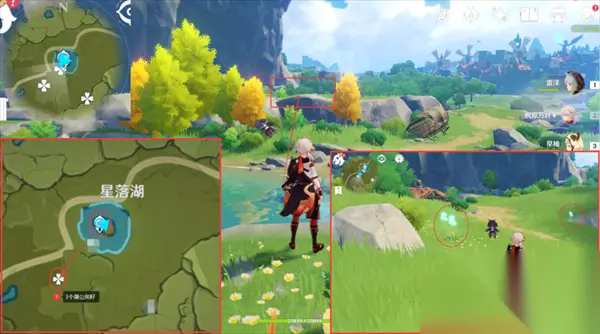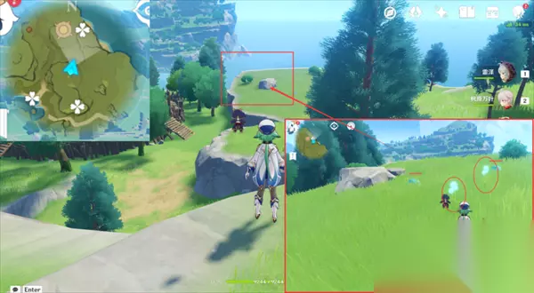 【路线2】3个蒲公英籽 7、我们来到星落湖的七天神像,朝着地图的西南方向一直走,爬上前面的小山体在前面就能看见三个蒲公英籽;