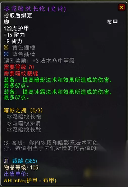 卡拉赞圣女掉落,属性很好,双槽。 3.冰霜暗纹长靴