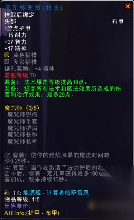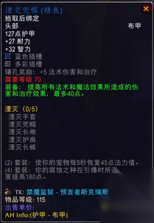 术士套装,属性很好,普通禁魔监狱就能掉落,这版本术士才是大儿子,法师只能试着夺嫡,当然要术士不在的时候。 6.唤醒者的预知头盔