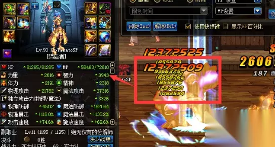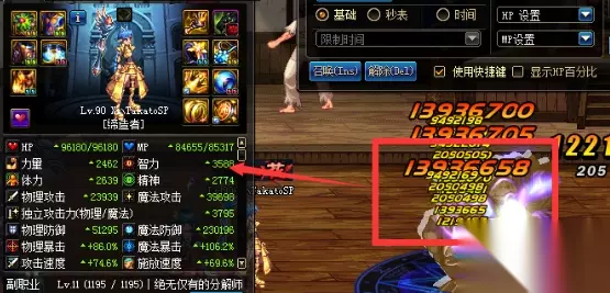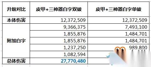从直观对比我们可以看出升级后,按照满属性计算& t4 _/ N( s6 \' G( ~7 v2 y4 C 智力力量-385点(装备词典满属性,此图非满属性) 所有属性强化-135点 的确基础降低得十分恐怖,那么伤害究竟如何呢?