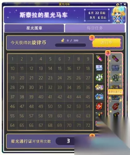 活动一:星光马车 完成星光马车的每日任务,可以获得旋律币,集满一天可获得的所有旋律币后,将得到一个星光图章,周末将得到两个星光图章。根据星光图章的数量可获得对应礼物。