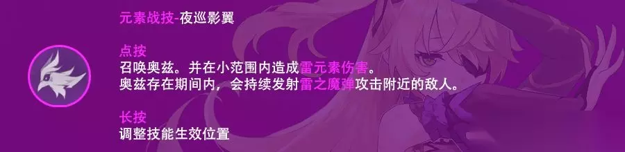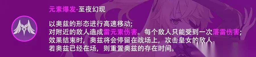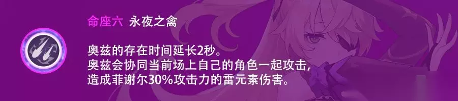 元素战技会召唤奥兹,奥兹在场上存在10s,冷却cd25s,每秒造成1次雷之魔弹伤害,一共造成1次召唤伤害以及9次雷之魔弹伤害,2命追加召唤伤害倍率,6命后追加奥兹存在时间2s,造成1次召唤伤害以及11次雷之魔弹伤害。 奥兹的召唤伤害附着雷元素,也是元素战技里最高的伤害,推荐召唤奥兹时贴近敌人释放来达到伤害最大化。 雷之魔弹附着雷元素规律为100100模式,即一次雷之魔弹附着雷元素后两次雷之魔弹弹不附着雷元素,3s附着一次雷元素。若三秒内雷之魔弹没有附着雷元素(无相缩壳等情况)则下一发雷之魔弹必定附着雷元素。 奥兹是菲谢尔的主要输出手段,配合大招操作得当的情况下能够保持奥兹全程在场。 3、元素爆发·至夜幻现(Q)