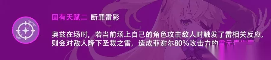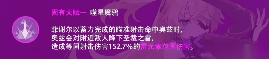 这个天赋需要蓄力射中奥兹才能触发,造成一次射击伤害152.7%的aoe雷伤,该次aoe雷伤视为蓄力射击,经过测试可以吃到弓藏的蓄力射击消减效果,同理可以吃到阿莫斯的被动加持。152.7%为独立乘区,可以近似视为增加了蓄力射击的倍率。但是菲谢尔的常用打法中很少有用到蓄力射击的时候,因此对于大部分玩家来说这个天赋没有什么价值。 此天赋的存在意义在于令菲谢尔可以使用雷伤蓄力弓的玩法。此流派的菲谢尔非常稀少,菲谢尔在这种玩法中在射速上有一些优势,但是伤害上还是无法和甘雨相比,不建议一般玩家尝试此玩法。 5、固有天赋-断罪雷影:
