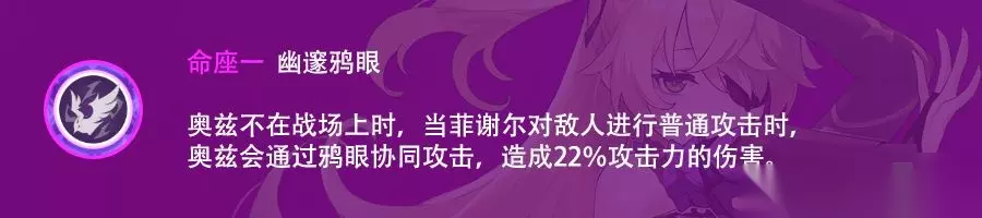 奥兹不在场上时菲谢尔普攻会在皇女肩侧生成一个黑球“鸦眼”每次菲谢尔普攻时“鸦眼”打出一次倍率固定为22%的普攻(可以享受普攻伤害加成但不能触发钢轮弓被动)。补充了一些菲谢尔的普攻伤害,对主C菲谢尔有一定提升。 二命·圣裁影羽