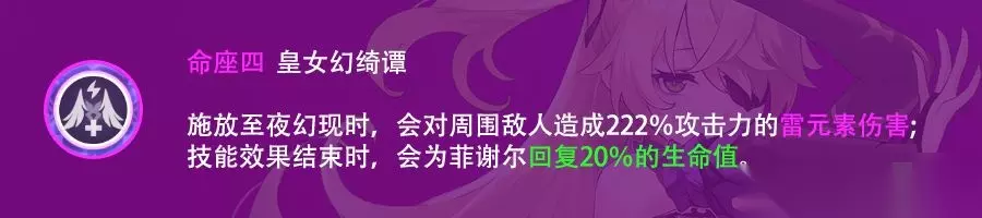 元素战技加三级,对于主要依靠奥兹打输出的菲谢尔可以算是关键命座。 四命·皇女幻绮谭