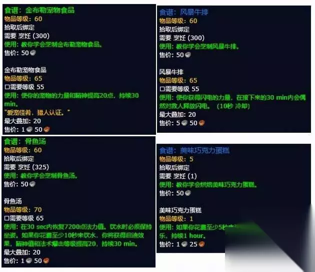 最后是食谱“香辣小龙虾”,联盟的朋友可以在泰罗卡森林“奥蕾莉亚要塞”的NPC“旅店老板贝莉比”那里买到;而部落的朋友则是从商人“伦格尔”那里买到,之前如果买“金色鱼柳”食谱的话可以顺便把小龙虾的食谱也买了。 具体用这三种里面的哪种来冲到375烹饪各位可以自行考虑。 另外,在外域还可以完成烹饪相关的日常任务,奖励是“一箱肉”或者“一桶鱼”,有一定几率会开出稀有食谱,比如下图所示的这几种。