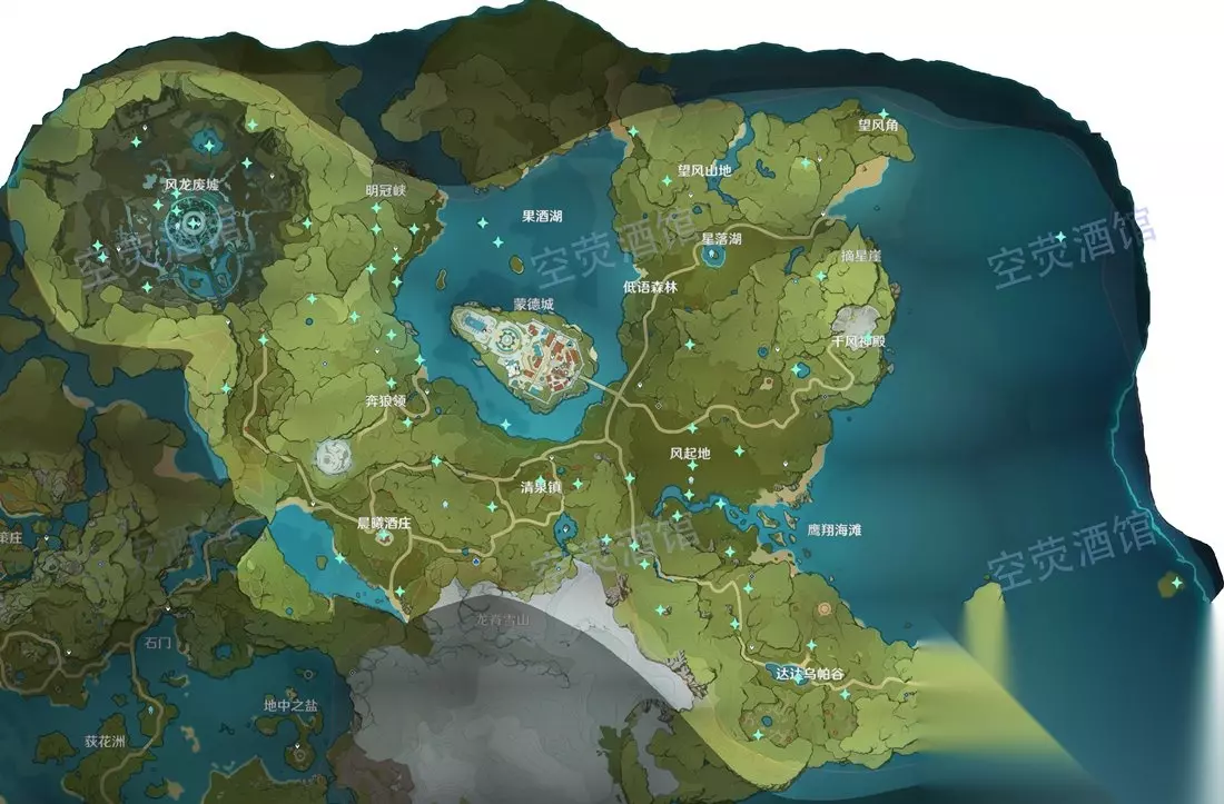 风神瞳分布位置图: 绿色星星图标为风神瞳,主要分布在蒙德大陆。