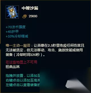 科技枪这件装备应该是现有的混伤型英雄中最强的一件装备了,这件装备对于寡妇来说绝对是必出的一件装备,在无限乱斗中,这件装备的主动技能在无限乱斗中只有8秒的CD,再加上这件装备超强的被动技能,寡妇等混伤英雄用起来看到对手那简直就像是看到了移动泉水,虽然刚开始治疗效果没有那么强,但是胜在技能可以无限使用,因此这个装备的被动就可以无限的触发,完全可以抵消掉减治疗的效果了。到了后期这件装备简直就是一件神器。 中娅沙漏
