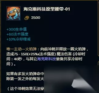 中娅沙漏这件装备在无限火力中绝对是一个保命的神装,在无限火力中这件装备的主动技能只有24秒。24秒一次的金身绝对可以让你逃过很多次必死的团战,再加上无限乱斗模式中本来召唤师技能CD就短,金身加闪现,绝对能够非常方便的逃生。再加上本身金身对于AP来说就是一件非常重要的装备,因此在无限火力中中娅这件装备是非常强势的。 海克斯科技腰带
