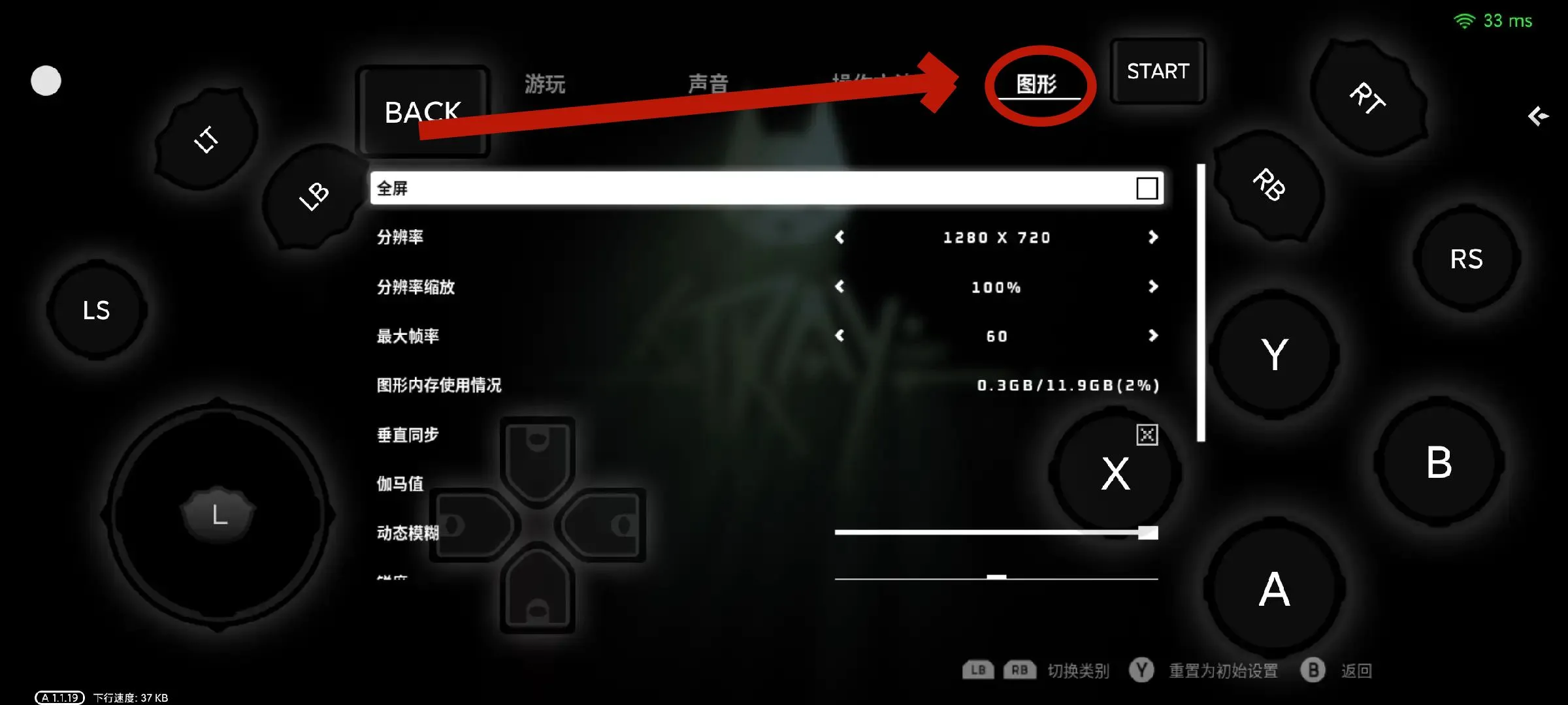 2.进来后,点击“RB”移动至【图形】界面,通过键盘方位往下滑