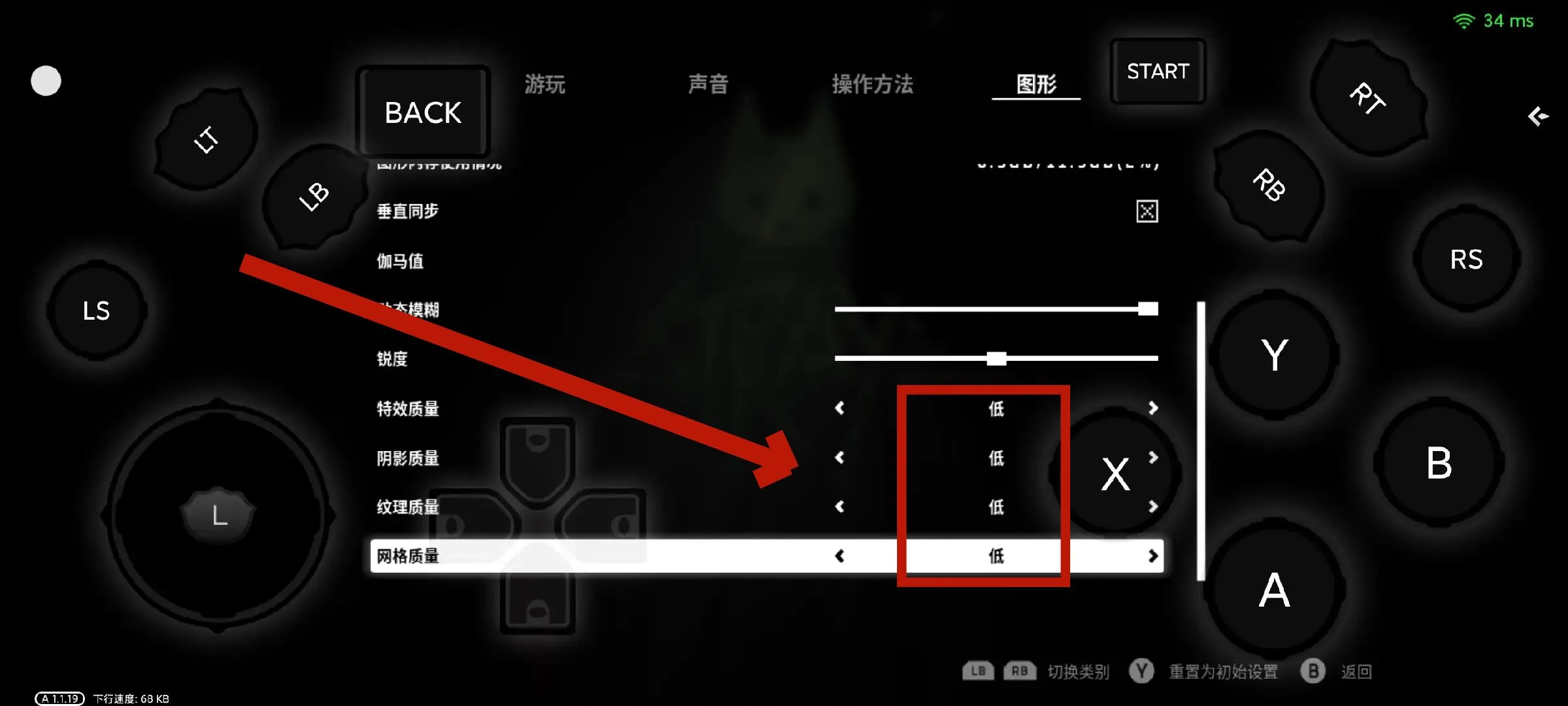 3.将最下面这4个质量调整为“低”,然后按”B“返回,再选择”是“确认调整即可