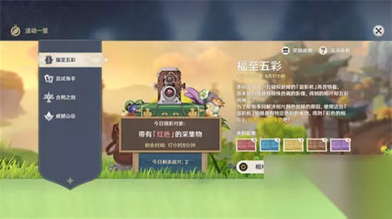 每天都有不同的拍摄目标,并会分为采集物和生物,找到符合拍摄条件的采集物或生物,使用留影机对准就会出现圆圈,只要对准就能拍摄成功了,在拍摄的时候注意调整好自己的视角,因为这个留影机是根据我们当前的视角来进行拍摄的。 例如:我们这边第一天的目标是拍摄红色的采集物,所以我们拍摄火树、火史莱姆这些生物是没有用的,需要拍摄的只有能够采集的素材,例如:日落果、风车菊等。 拍摄成功之后会随机获得一种颜色的相片,在本次活动中一共会有5种不同颜色的相片,每天有10次获得相片的机会,当玩家们收集齐了一套相片之后就能够回到季同NPC的位置兑换奖励了,奖励稳定包含有60原石,以及一些经验书等奖励。
