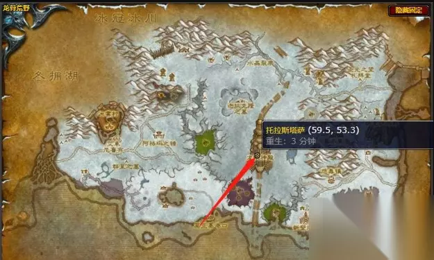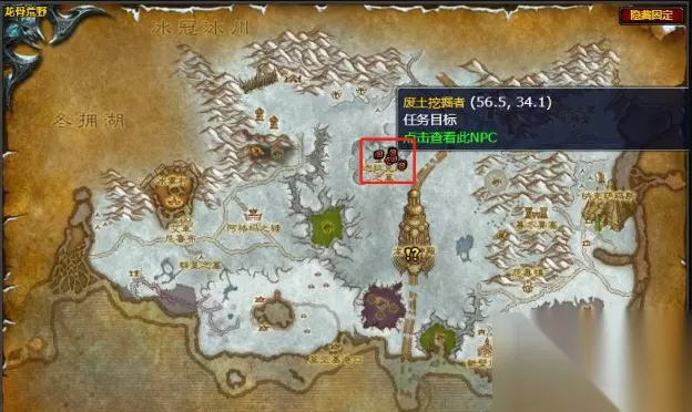 废土挖掘者在迦拉克隆之墓附近,其中坐标有(56.5-34.1),如下图红圈内所示,击杀30个之后,就可以飞去迦拉克隆之墓旁的邪恶之旋,消灭通灵主宰安提沃克,夺取安提沃克的镰刀