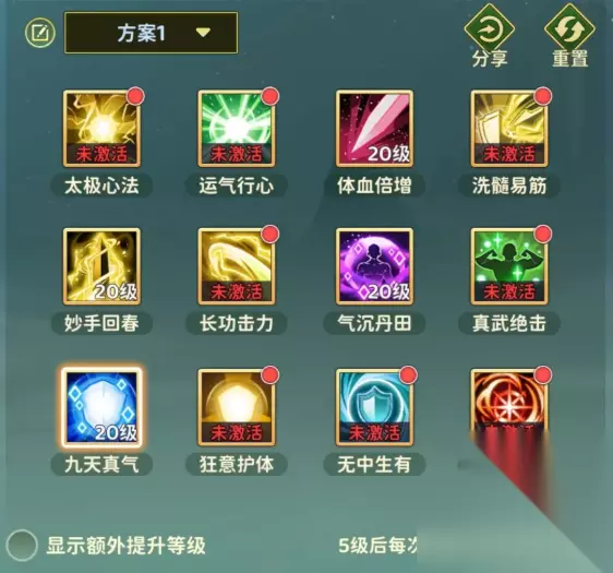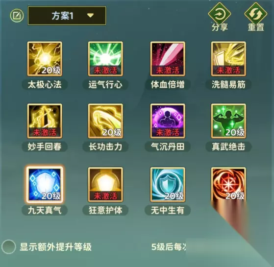 二、输出流 1、一转:太极心法(提高武功攻击和武功命中)+长攻击力(提升武功威力) 2、二转:真武绝击(提高武功会心率) 3、三转:九天真气,必须点满,这是医师的核心buff技能,可以加成所有光环效果 4、四转:无中生有(概率追伤) 5、五转:吸星大法(大幅提高武功会心伤)