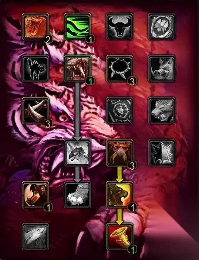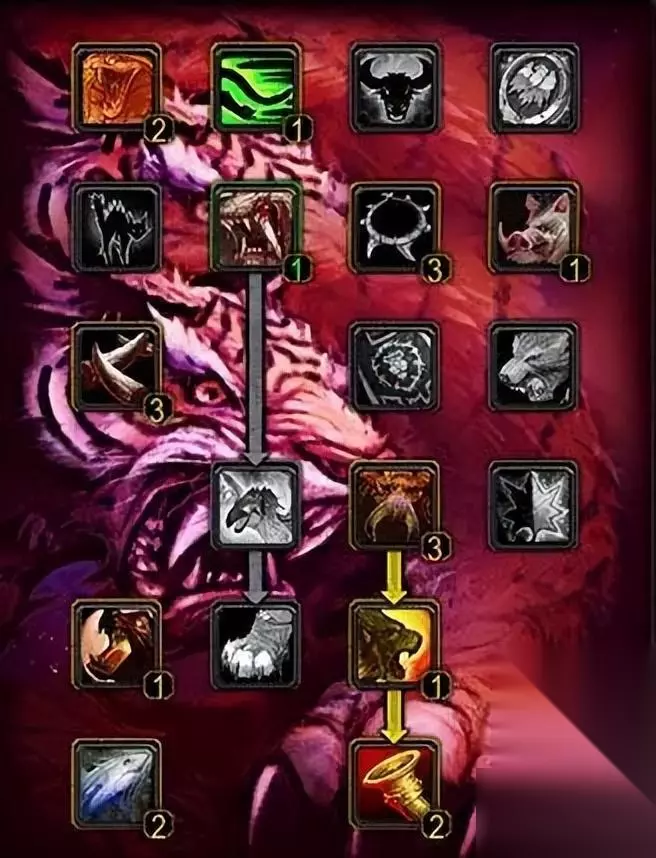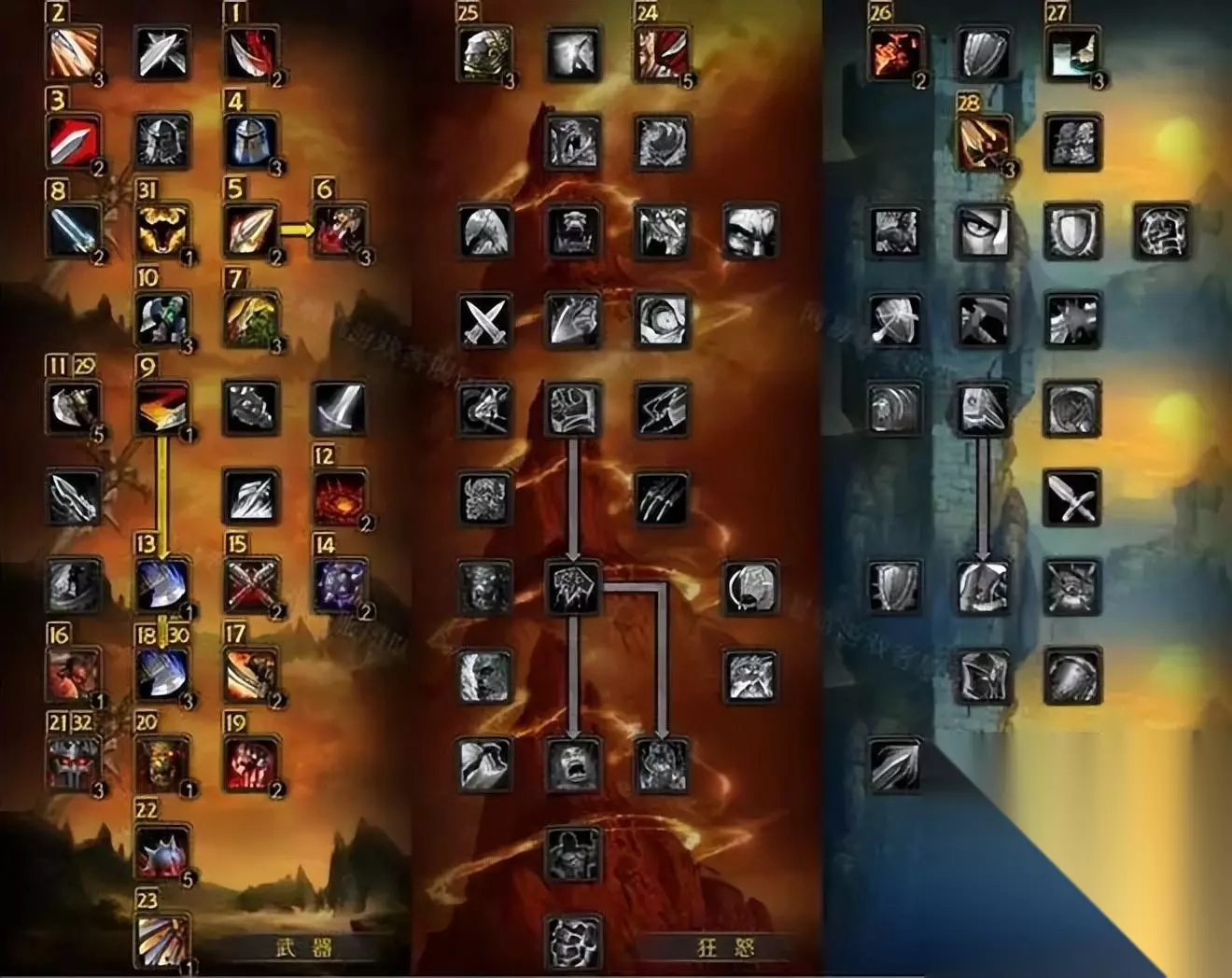 战士 武器战 55武器/8狂怒/8防护(命中堆到263点、精准堆到132点。其他属性优先级:爆击>力量>攻击强度>敏捷>护甲穿透>急速。) 先点出武器的51点,再点出狂怒的8点和防护的8点,最后再补上武器的4点。下面的是天赋示意图,图标左上方的数字为点天赋的顺序。其中,长柄专精、锤类武器专精、剑类武器专精请根据自己使用的武器的类别自行选择。