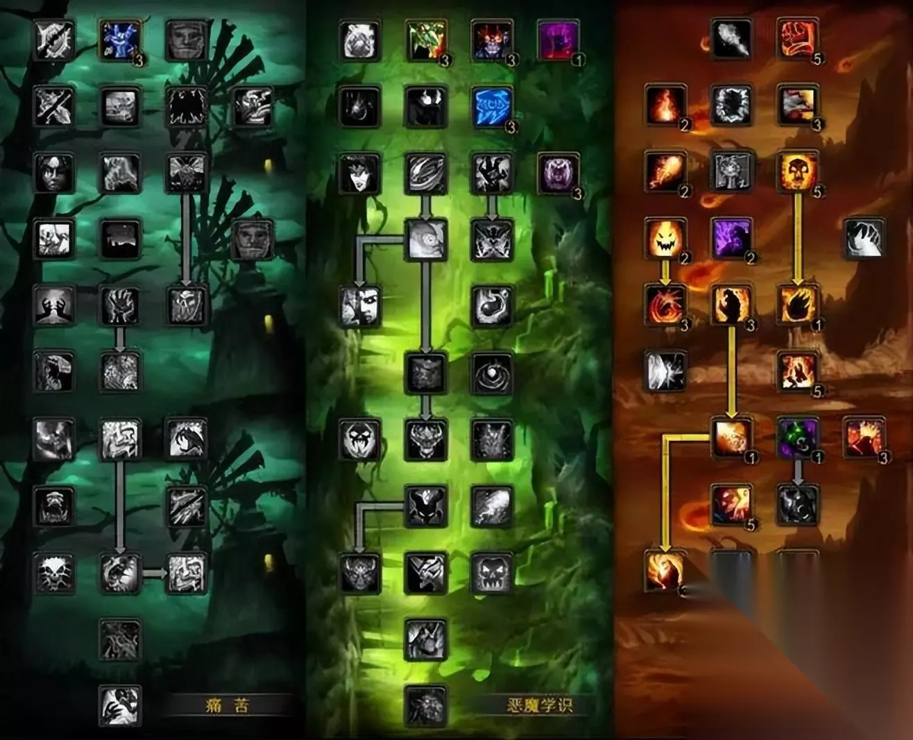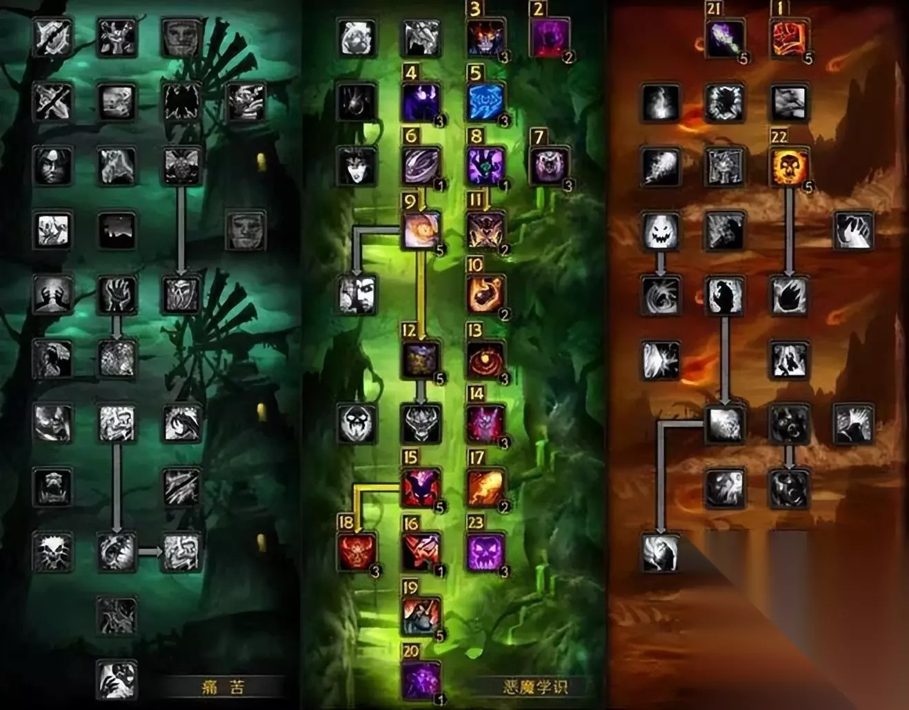 恶魔 56恶魔学识/ 15毁灭 (命中达标17%后,属性优先级为法术强度>急速>精神>爆击) 下面是天赋示意图,图标左上方的数字为点天赋的顺序。