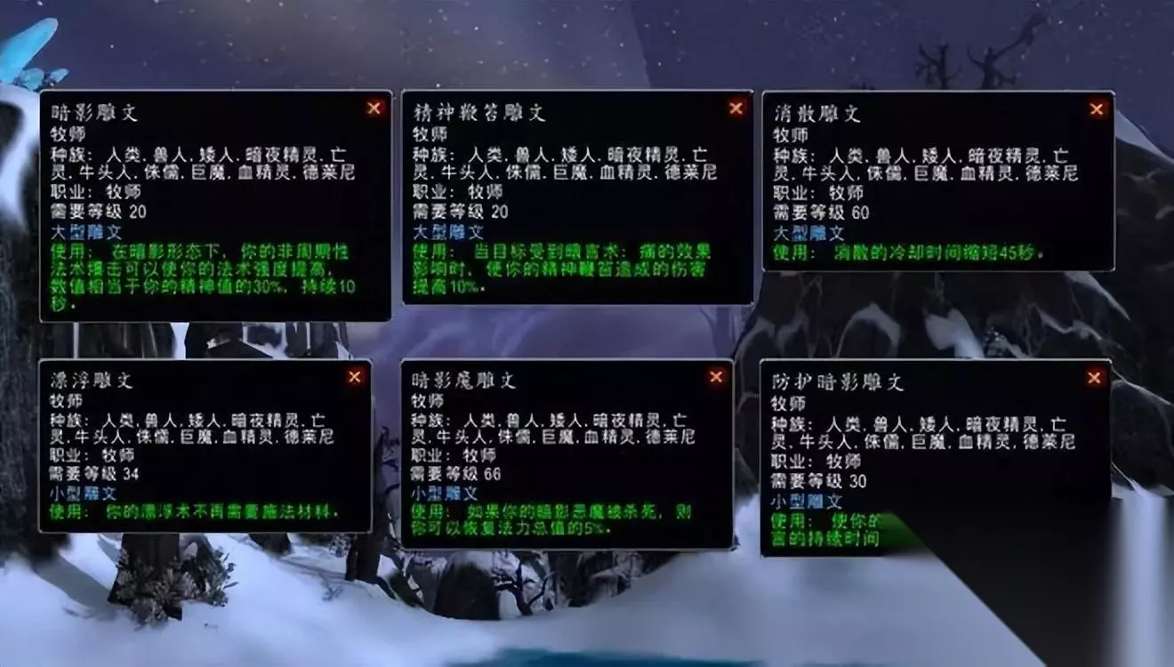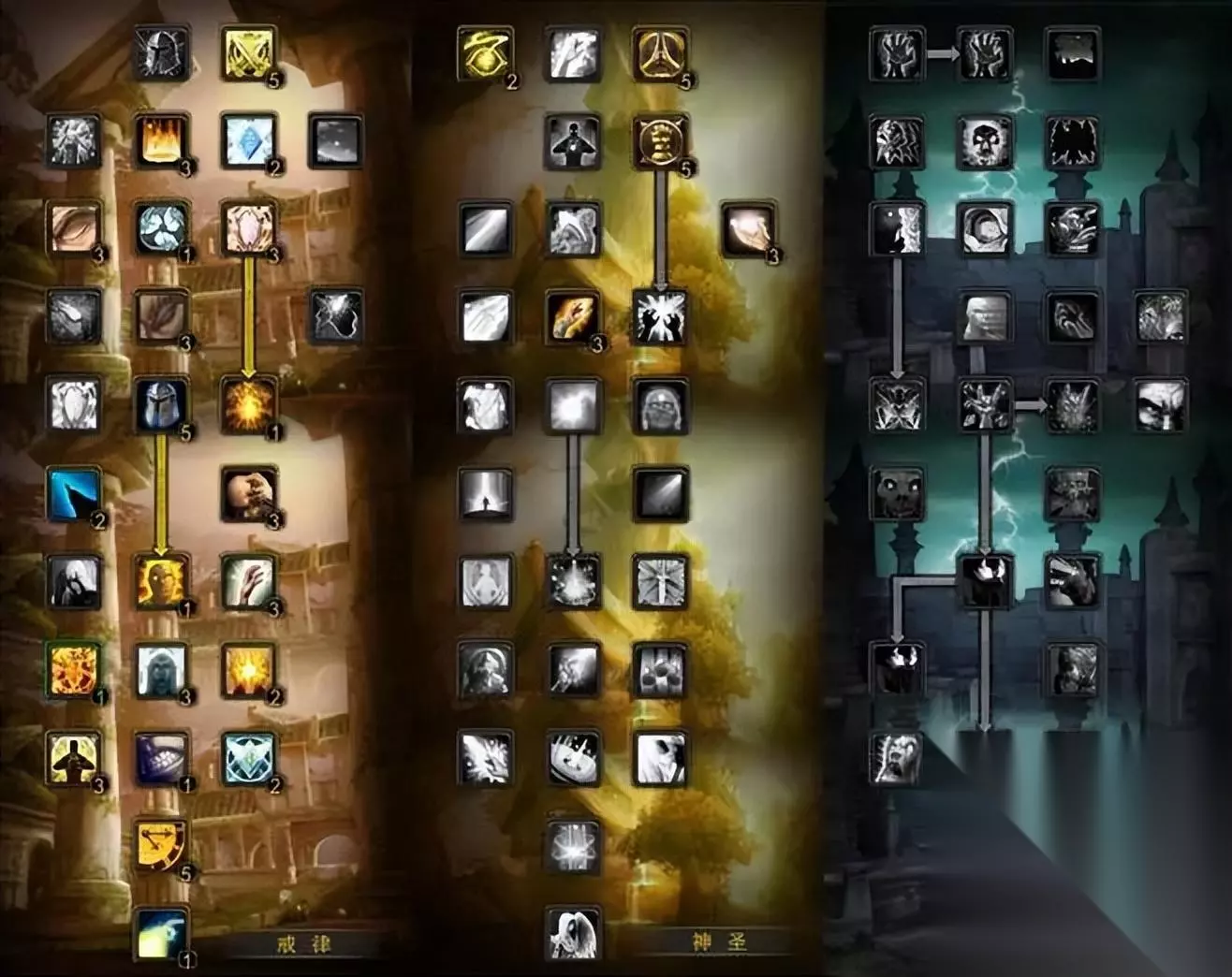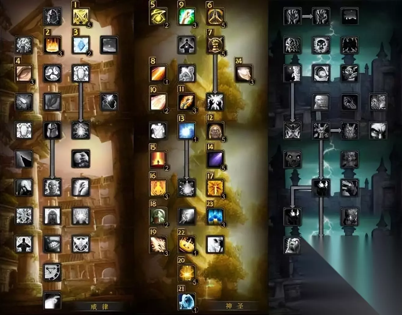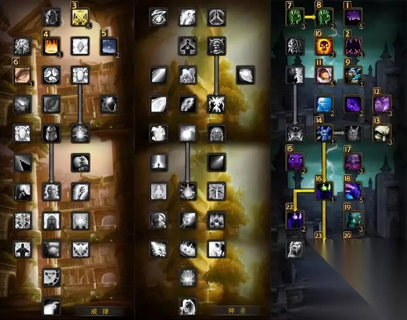 牧师 暗牧 13戒律/58暗影(在命中达标11%的情况下,各属性收益如下:法术强度>急速>爆击>精神>智力) 先点出8点暗影,然后点出13点戒律,再点出暗影剩余的点数。下面的是天赋示意图,图标左上方的数字为点天赋的顺序。
