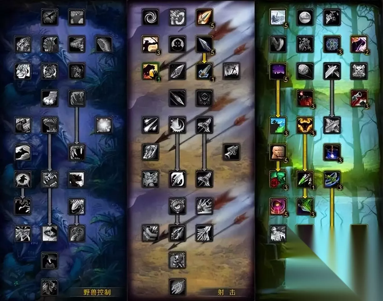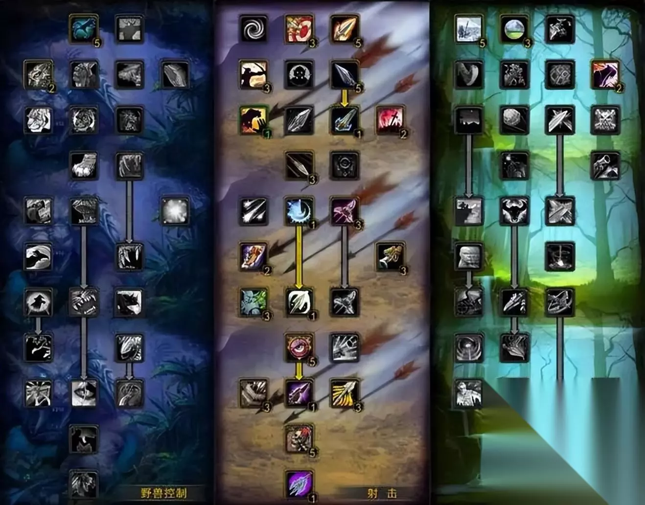 射击猎 54射击/10生存/7野兽控制(属性优先级:命中达标8%>敏捷>护甲穿透>爆击>攻强>急速。) 如果团队不需要猎人提供强击光环,可以将点数挪给急速恢复。如果有机会卡CD使用爆炸陷阱,则将鹰眼的3点挪给陷阱掌握。