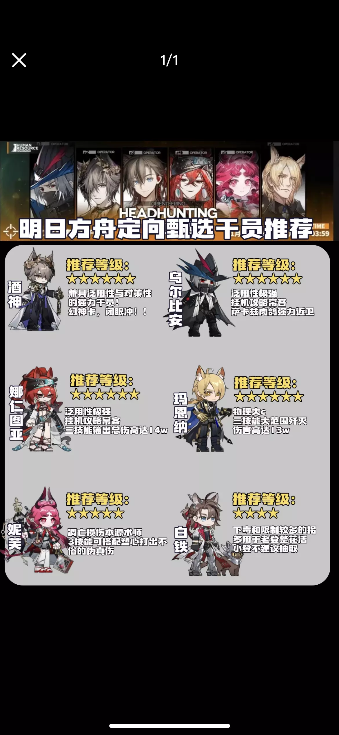 6选3优先顺序:酒神>乌尔比安/娜仁图亚>玛恩纳>妮芙>白铁 如果酒神、乌尔比安、娜仁图亚、玛恩纳都没有可以考虑直接冲捞一手,抽到谁都不亏~如果其他干员酌情看资源下池!当然还是优先半周年。 老马因为作为老六星已经进店了,所以推荐程度稍微低了一级~ 个人向推荐含主观,如有冒犯致歉( #明日方舟 #明日方舟攻略 #手游推荐 #游戏攻略 #游戏推荐 #明日方舟定向甄选 #明日方舟半周年