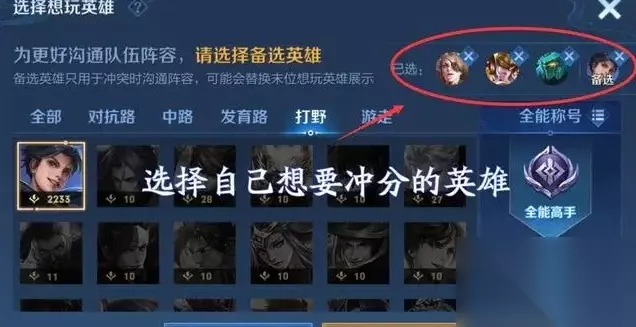 王者荣耀战力刷取教程1、确定常玩分路英雄:首先第一点就是得在开局前选好我们想要玩以及可以补位的英雄。