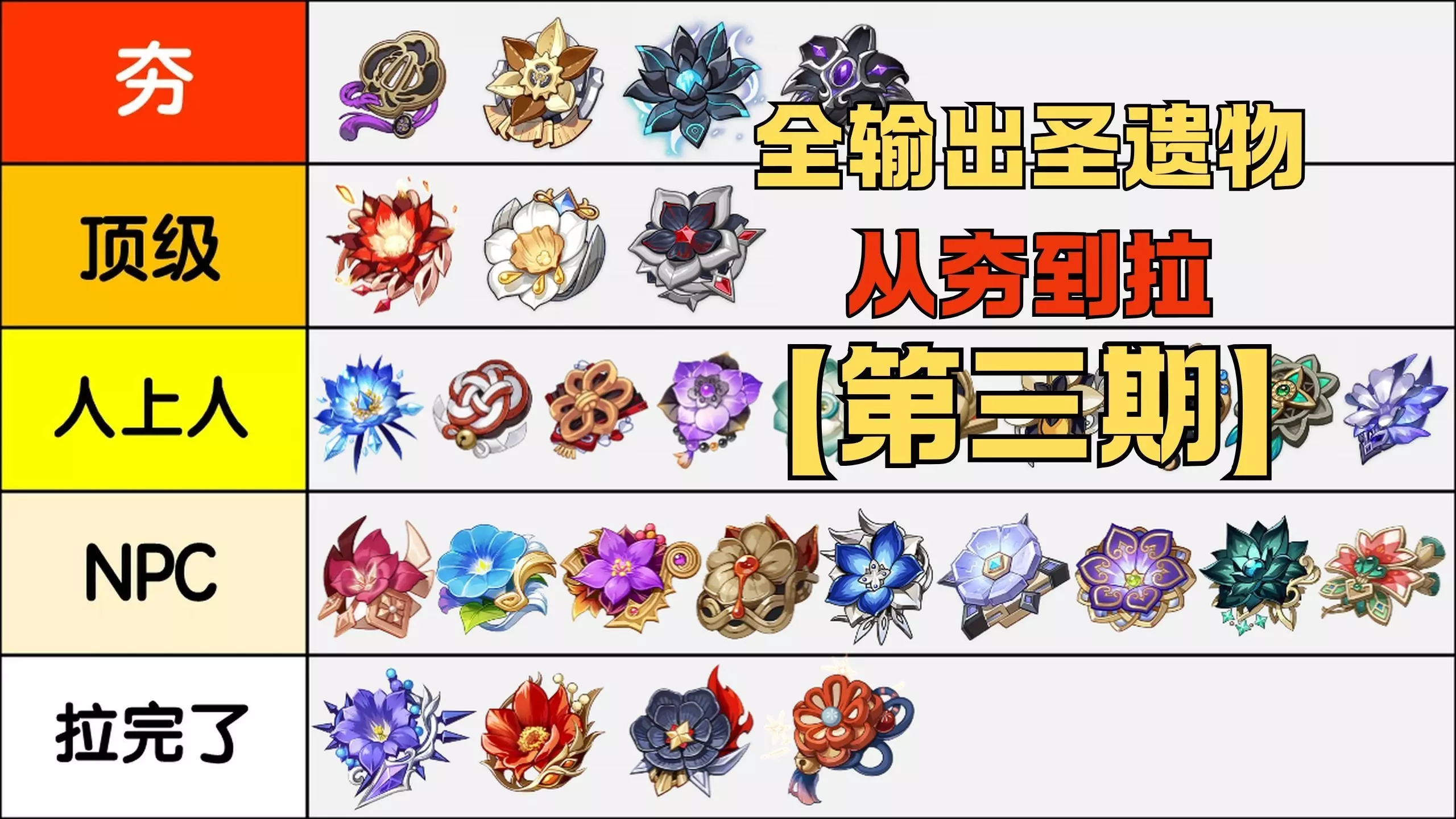 第一期包含了1.0时期时装的圣遗物 后续还会预计用2期的篇幅评价其他版本圣遗物 最终综合评分: 0-7 拉完了 7-10 NPC 10-12 人上人 12-14 顶级 14+ 夯